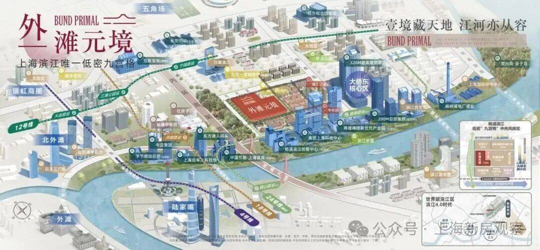 中建壹品·外滩元境择址世界科创滨江九宫格板块,循着上海“一江一河”城市战略的宏大叙事脉络,精准落子“东外滩”与杨浦“世界科创滨江”交汇的稀贵版图。