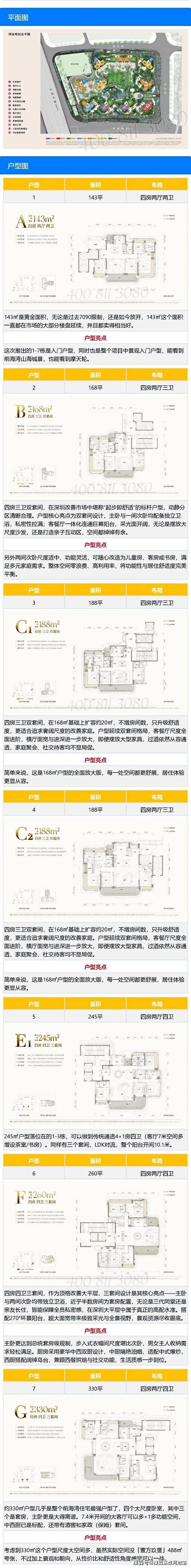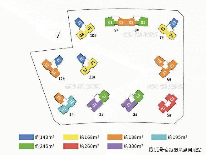 按照项目的过程版总图及户型图,可见项目有11栋(12个单元)楼,纯大户型,面积在-253-332平。